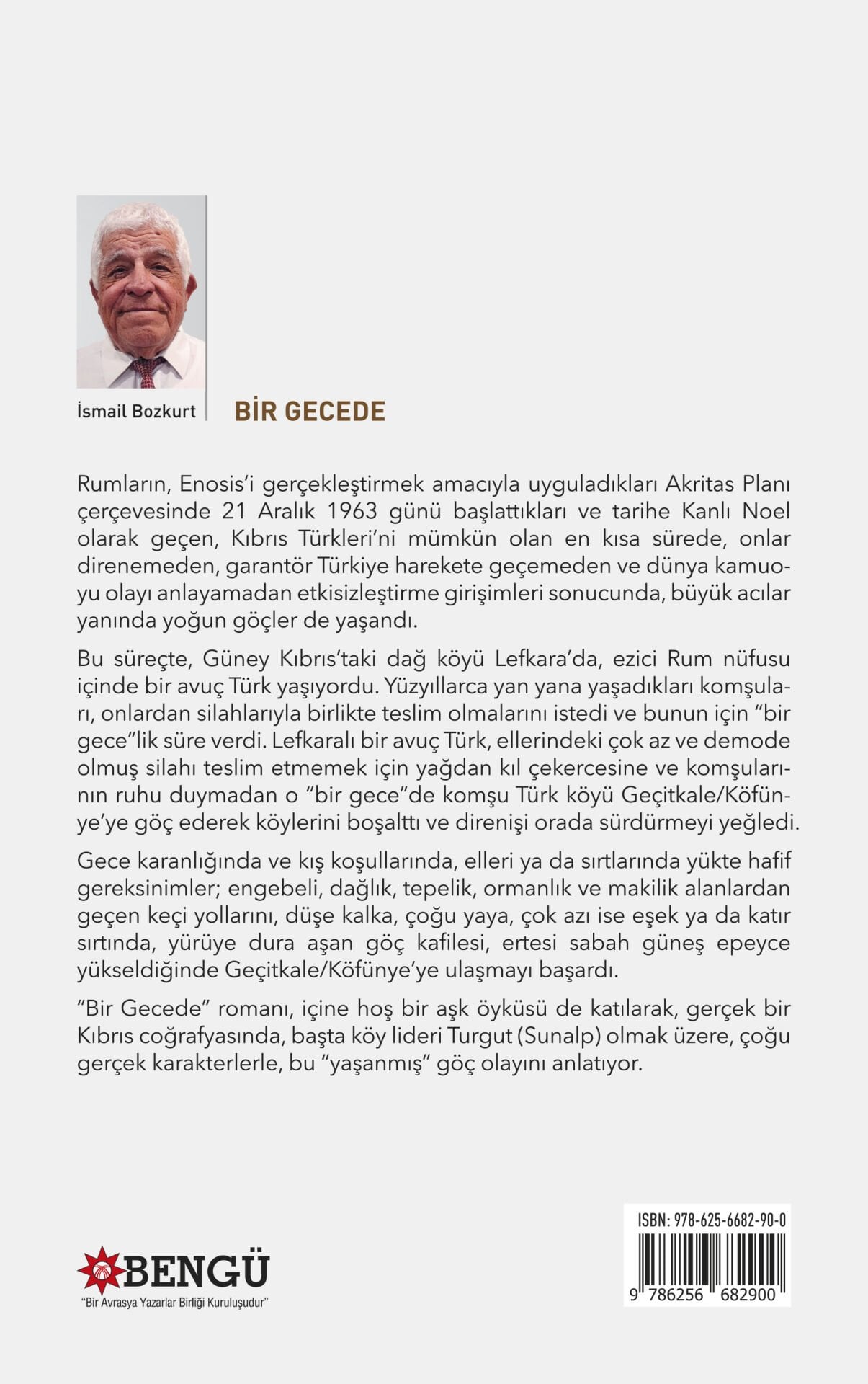 “Bir Gecede” romanı, içine hoş bir aşk öyküsü de katılarak, gerçek bir Kıbrıs coğrafyasında, başta köy lideri Turgut (Sunalp) olmak üzere, çoğu gerçek karakterlerle, bu “yaşanmış” göç olayını anlatıyor.