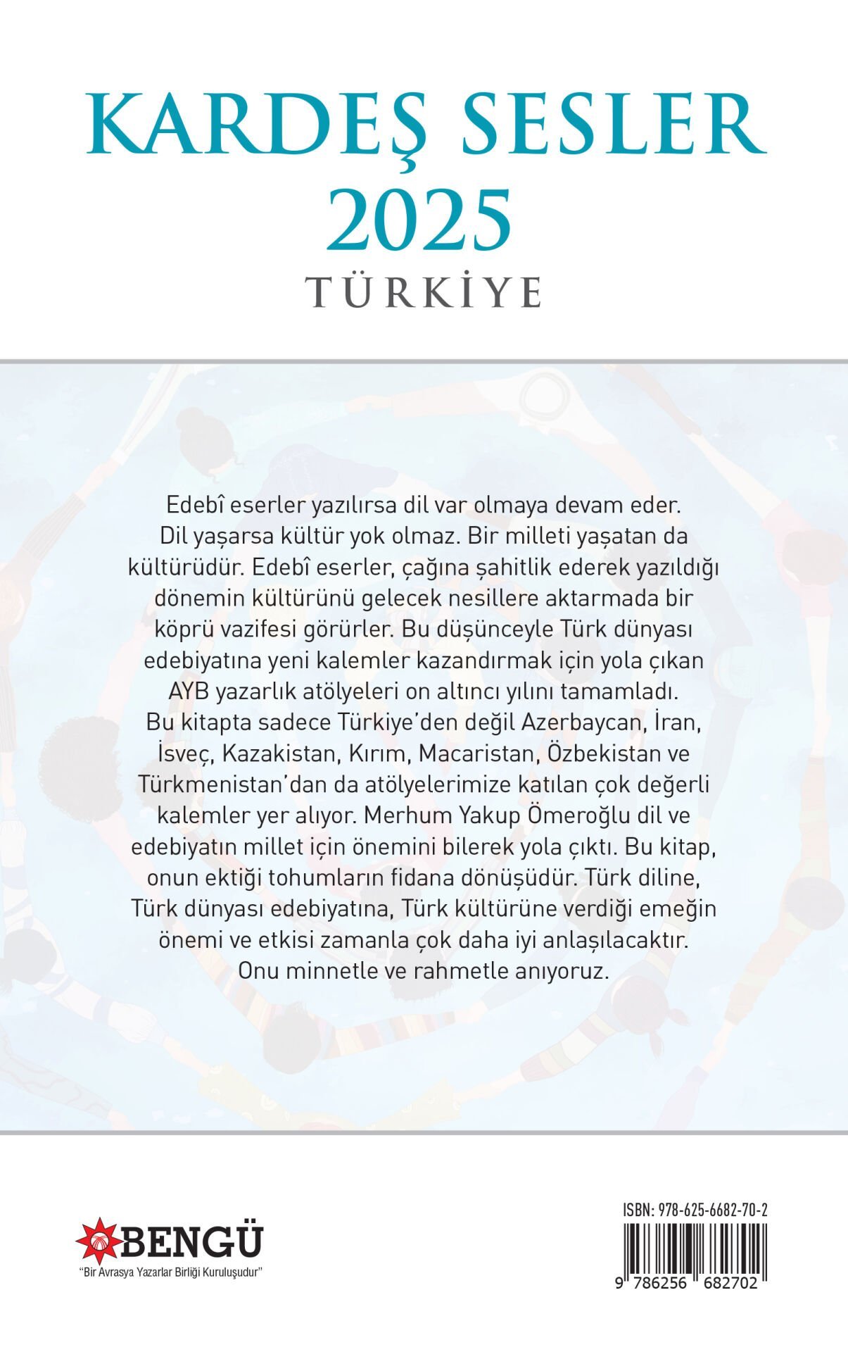 Edebî eserler yazılırsa dil var olmaya devam eder. Dil yaşarsa kültür yok olmaz. Bir milleti yaşatan da kültürüdür. Edebî eserler, çağına şahitlik ederek yazıldığı dönemin kültürünü gelecek nesillere aktarmada bir köprü vazifesi görürler. Bu düşünceyle Türk dünyası edebiyatına yeni kalemler kazandırmak için yola çıkan AYB yazarlık atölyeleri on altıncı yılını tamamladı. Bu kitapta sadece Türkiye’den değil Azerbaycan, İran, İsveç, Kazakistan, Kırım, Macaristan, Özbekistan ve Türkmenistan’dan da atölyelerimize katılan çok değerli kalemler yer alıyor. Merhum Yakup Ömeroğlu dil ve edebiyatın millet için önemini bilerek yola çıktı. Bu kitap, onun ektiği tohumların fidana dönüşüdür. Türk diline, Türk dünyası edebiyatına, Türk kültürüne verdiği emeğin önemi ve etkisi zamanla çok daha iyi anlaşılacaktır. Onu minnetle ve rahmetle anıyoruz.